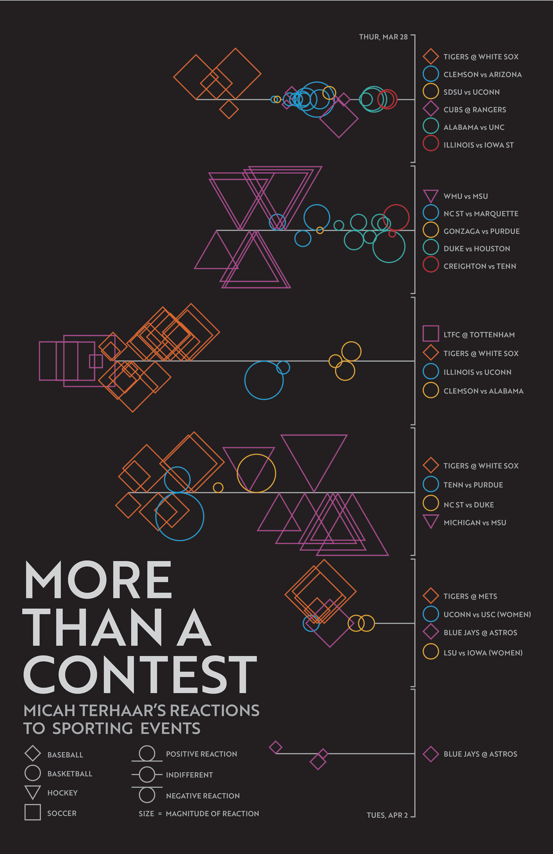 The Data Vis project was devoted to the gathering of information & turning it into a visually interesting & understandable graphic. I chose to track my reactions to sporting events that I watched throughout the week. Data included, game, date, time, magnitude of the reaction, & whether the reaction was positive, negative, or neutral.